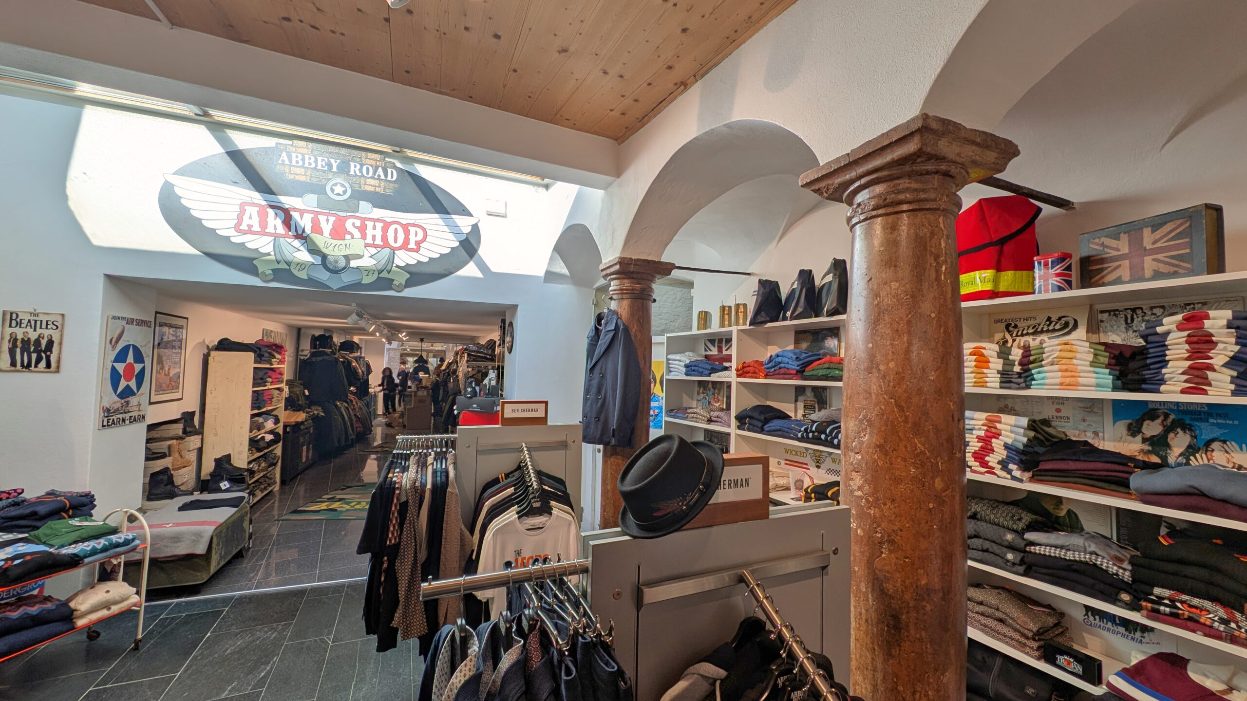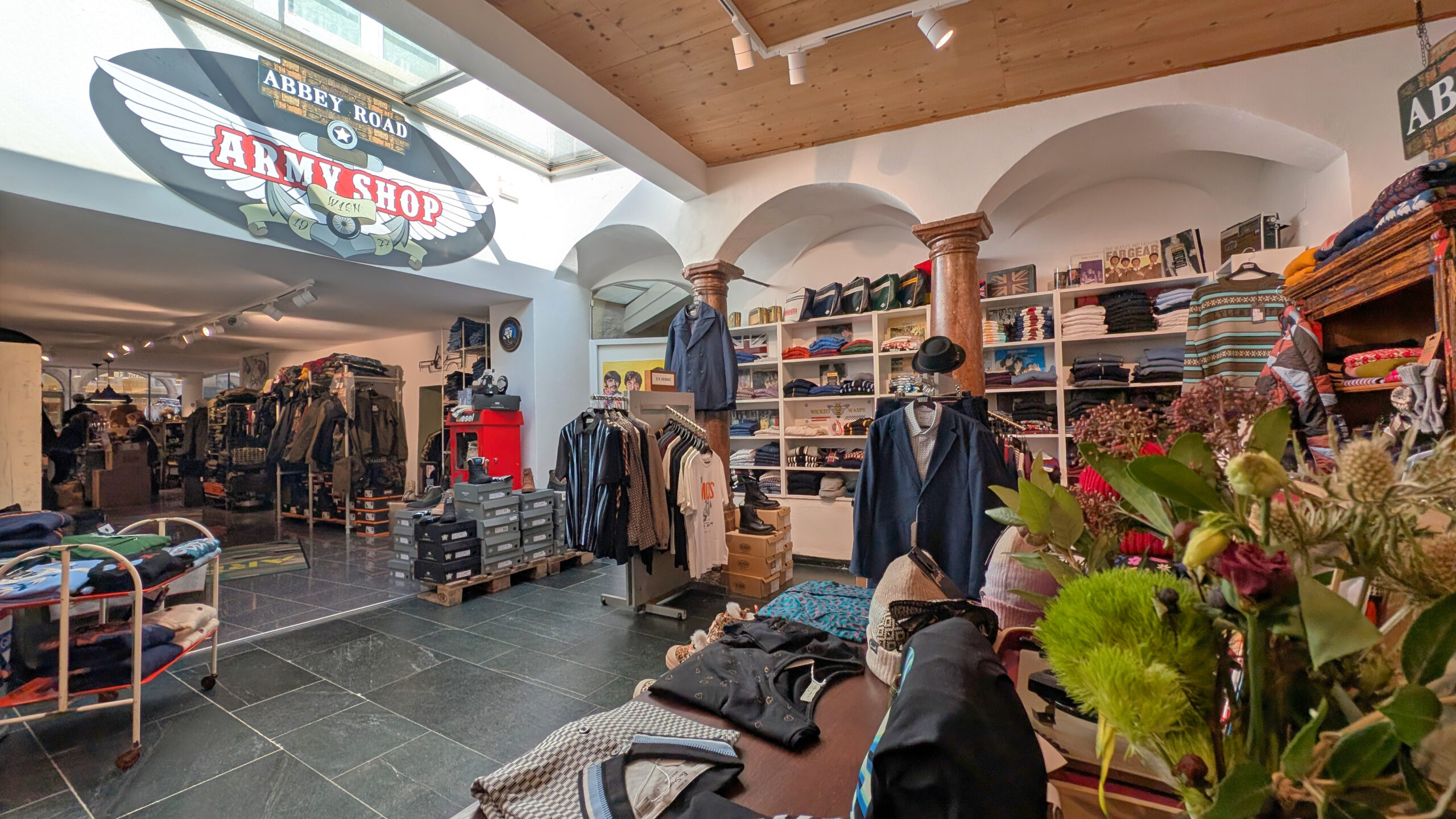 Großzügige Belichtungsflächen und ein durchgehendes Oberlichtband sorgen für eine helle, freundliche Atmosphäre im langgezogenen Verkaufsraum. In Kombination mit einer sorgfältigen Materialwahl und einer gezielten Lichtgestaltung entstand ein unverwechselbarer Rahmen für die Präsentation hochwertiger Army- und Outdoor-Bekleidung sowie britischer Modeklassiker.