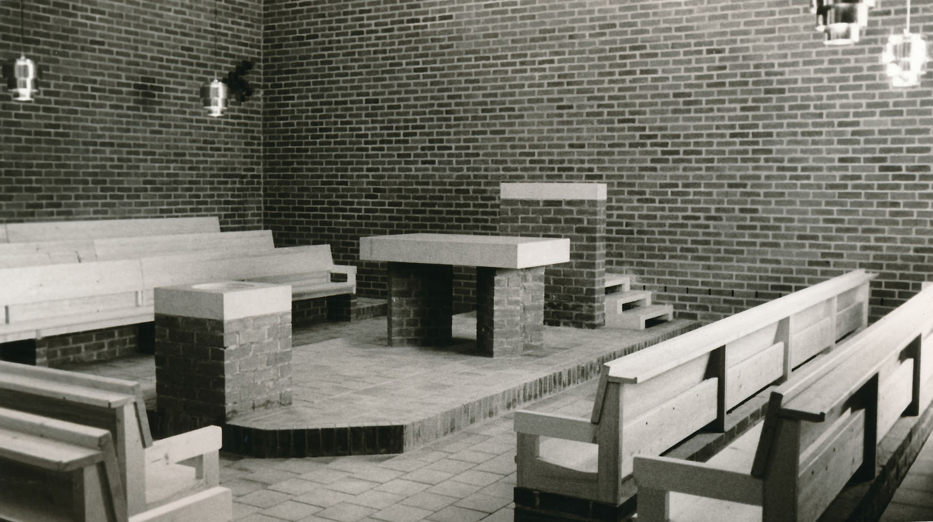 1969. Die bisherige hölzerne Schaitbergkirche war baufällig und wurde durch einen Neubau in klarer, schlichter Stahlbetonbauweise ersetzt. Der Entwurf von Architekt Dipl.-Ing. Jakob setzt durch seine prägnante Form ein städtebauliches Zeichen im Ortsgefüge und erzeugt eine klare, zeitgemäße Präsenz, die zugleich respektvoll mit der Umgebung harmoniert.