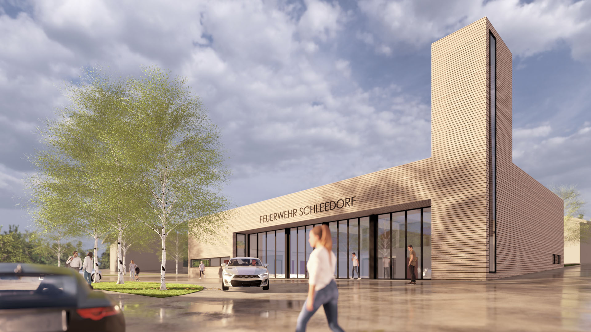 Der markante Schlauchturm übernimmt neben seiner funktionalen Aufgabe auch eine städtebauliche Rolle: Er setzt ein weithin sichtbares Zeichen und bietet dem neuen östlichen Ortsteil von Schleedorf eine prägnante Orientierung. Durch die Ost-West-Orientierung des Baukörpers entsteht zugleich ein wirksamer Schallschutz für die angrenzende Wohnbebauung im Norden. Die Fahrzeughalle öffnet sich nach Süden; ein Rücksprung in der Fassade bietet baulichen Schutz vor der windexponierten Lage.