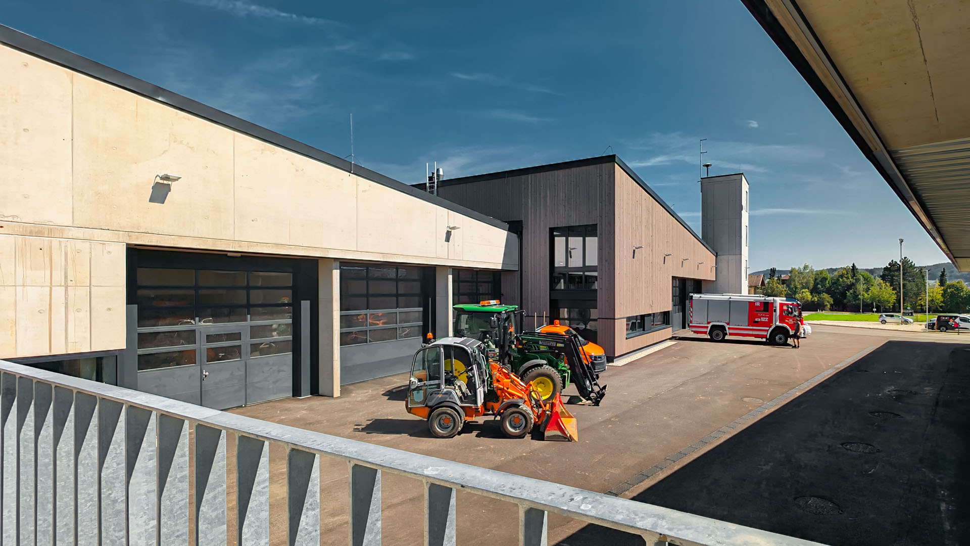 Das Feuerwehrgebäude wurde nach höchsten Sicherheits- und Effizienzstandards konzipiert. Die Architektur vereint robuste Materialien mit lichtdurchfluteten Räumen, um ein funktionales und angenehmes Arbeitsumfeld zu schaffen. Die großzügige Fahrzeughalle ist für moderne Feuerwehrfahrzeuge ausgelegt und gewährleistet schnellen und sicheren Einsatz. Umkleiden, Kommando- und Bereitschaftsräume, Büros, Schulungsräume sowie Werkstätten und Lagerräume sind so um die zentrale Fahrzeughalle angeordnet, um den Anforderungen der Feuerwehr zu entsprechen. Ein moderner Schlauchturm dient sowohl der Trocknung von Schläuchen als auch für Übungszwecke. Eine klare Gliederung von Verkehrs-, Park- und Einsatzzonen sowie kurze Wegführungen im Einsatz waren wesentliche Kriterien der Planung.